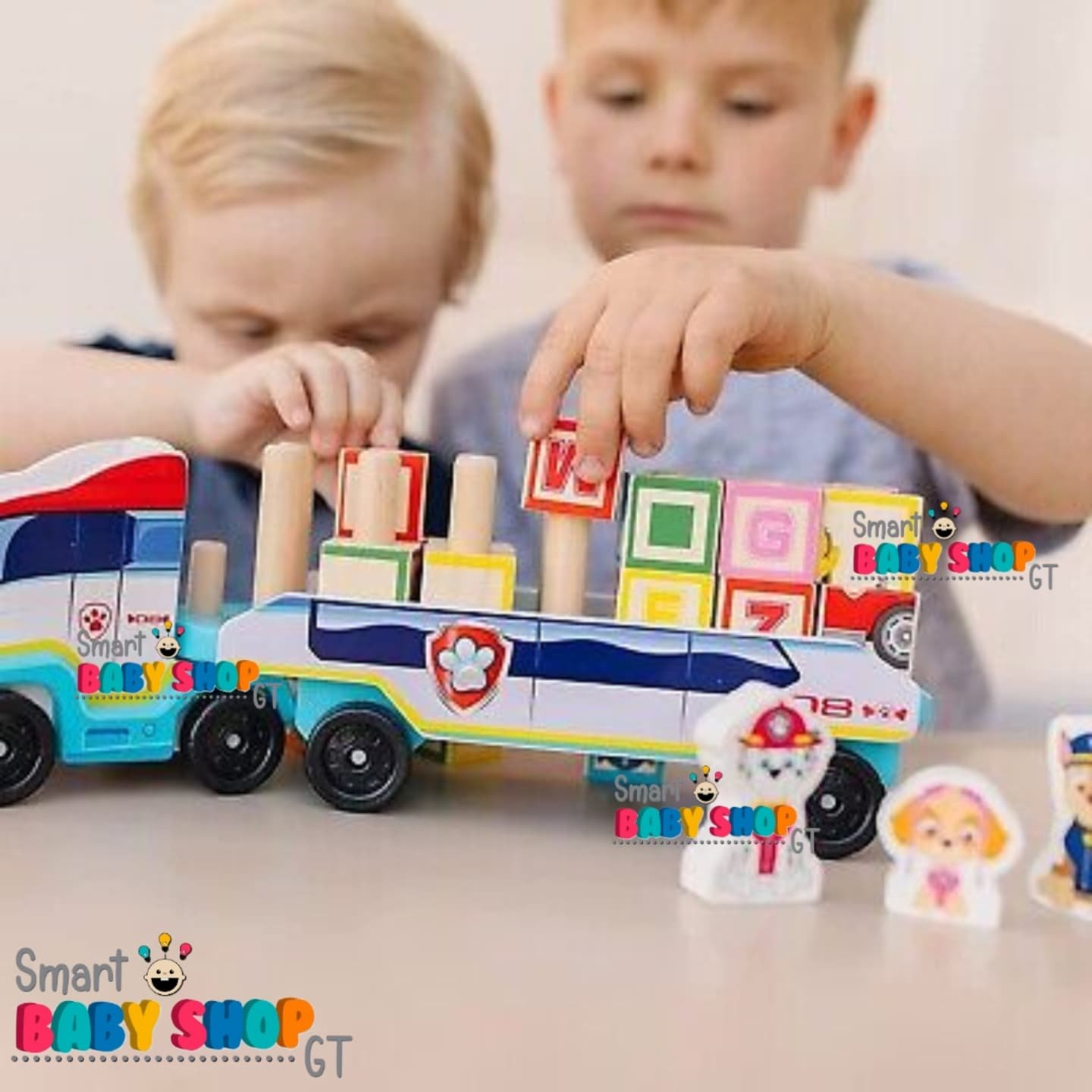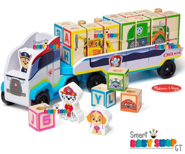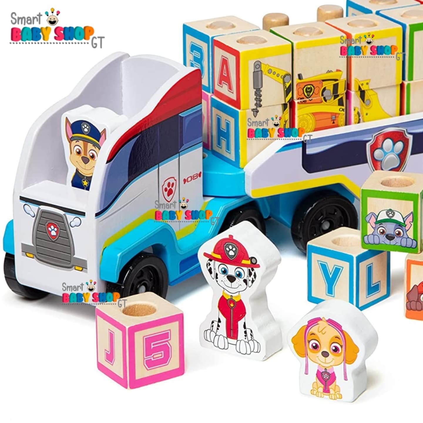 Marca Melissa & Doug. Medidas: El camión mide 34cm de largo y cada cubito mide 3x3cm. Material: madera. Contiene el camión y 28 cubos apilables. Los bloques incluyen letras, números, formas, escenas para unir (los bordes están codificados por colores). Incluye 3 figuras de juego de madera de la serie animada Paw Patrol (Chase, Marshall y Skye)