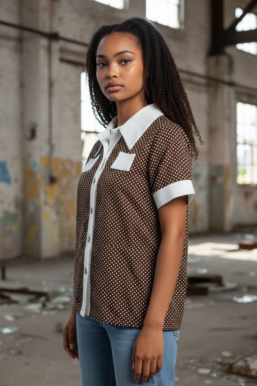 Fabricada en una mezcla de poliéster y algodón, brinda una textura ligera, fresca y resistente, ideal para uso diario o looks casuales. El estampado de puntos blancos sobre fondo café añade un toque chic y actual, perfecto para crear outfits únicos y llenos de personalidad.