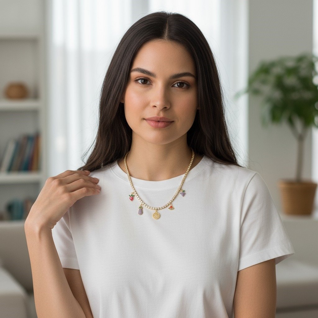 Collar tipo tenis con colgantes de frutas bano de oro de 18K