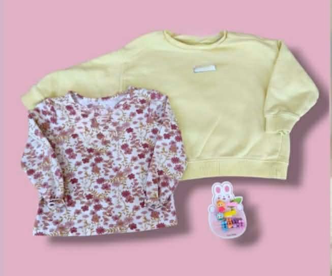 conjunto de algodón, incluye tres piezas una blusa estampada manga larga,una blusa amarilla manga larga y un cartoncito de ganchos talla 12 meses