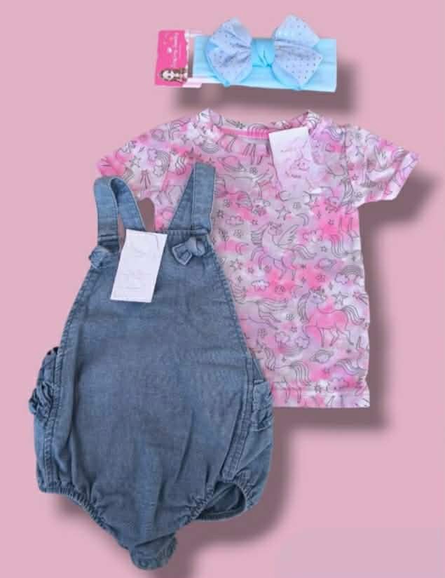 conjunto de algodón,incluye tres piezas, una blusa estampada un jumper tipo jeans y un moño celeste talla 18 meses