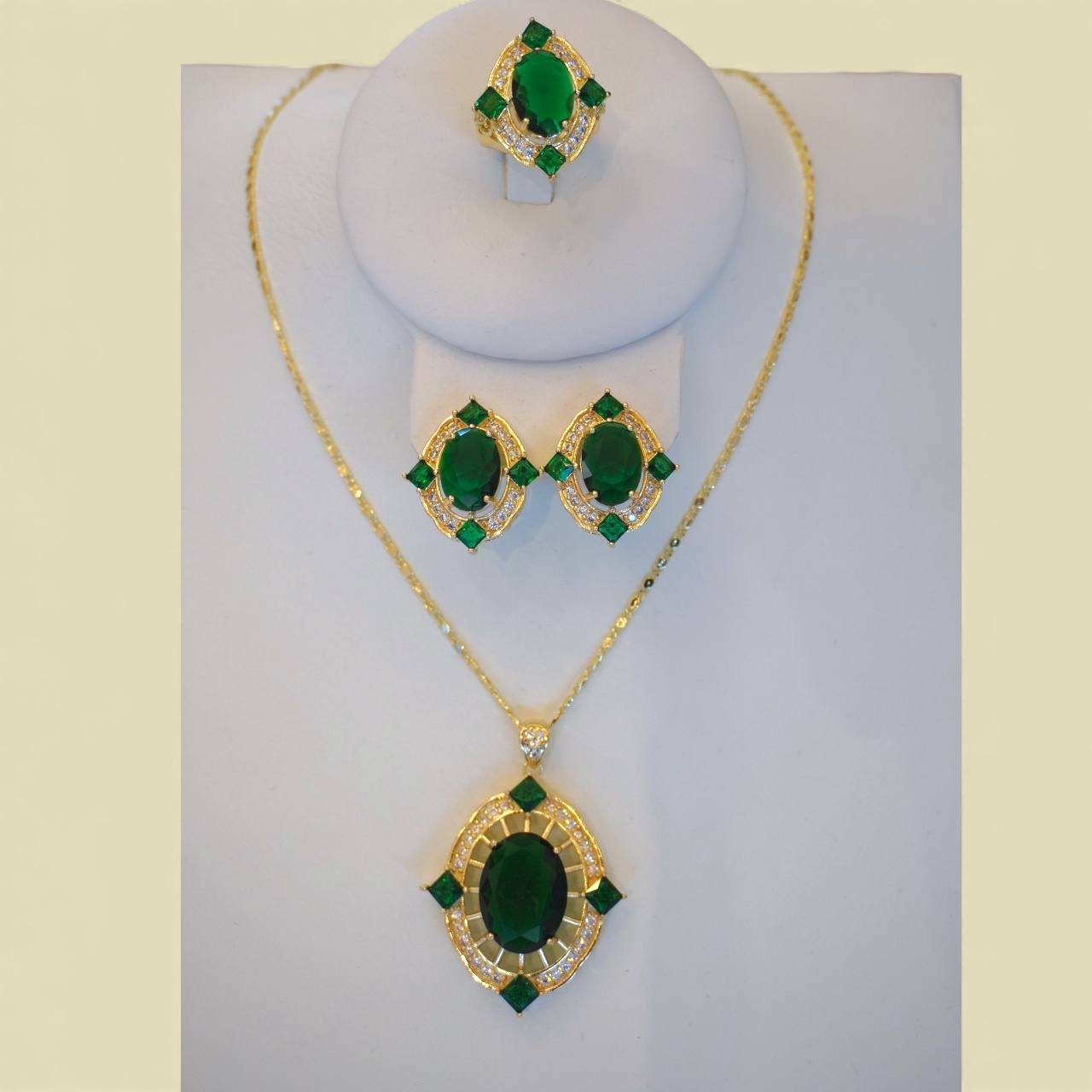 Juego verde grande aretes, anillo y collar bano de oro de 18K