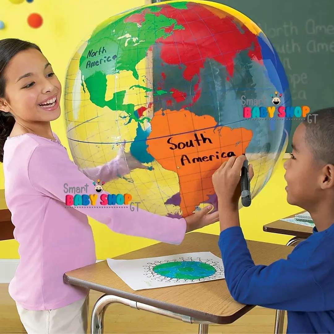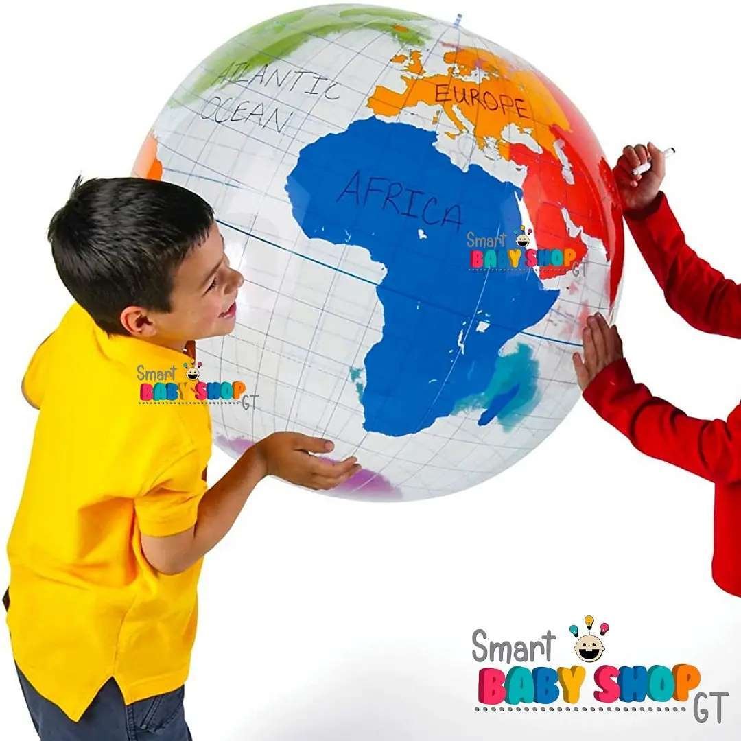 Marca Learning. El globo de vinilo mide 68.5cm de diámetro y funciona mejor con un marcador borrable. Incluye kit de reparación, guía de actividades.
