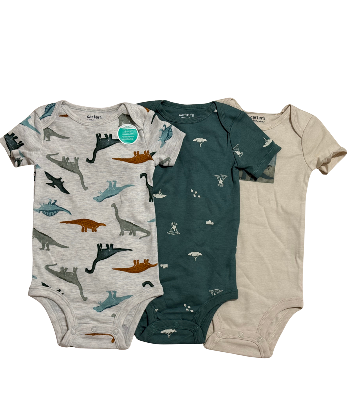 Set de mamelucos para bebé marca Carter’s Child of Mine, confeccionados en tela suave y transpirable. Diseño de manga corta con broches inferiores para fácil cambio de pañal, estampados DINOSAURIO delicados y colores neutros ideales para uso diario. Cómodos, prácticos y perfectos para la piel sensible del bebé.