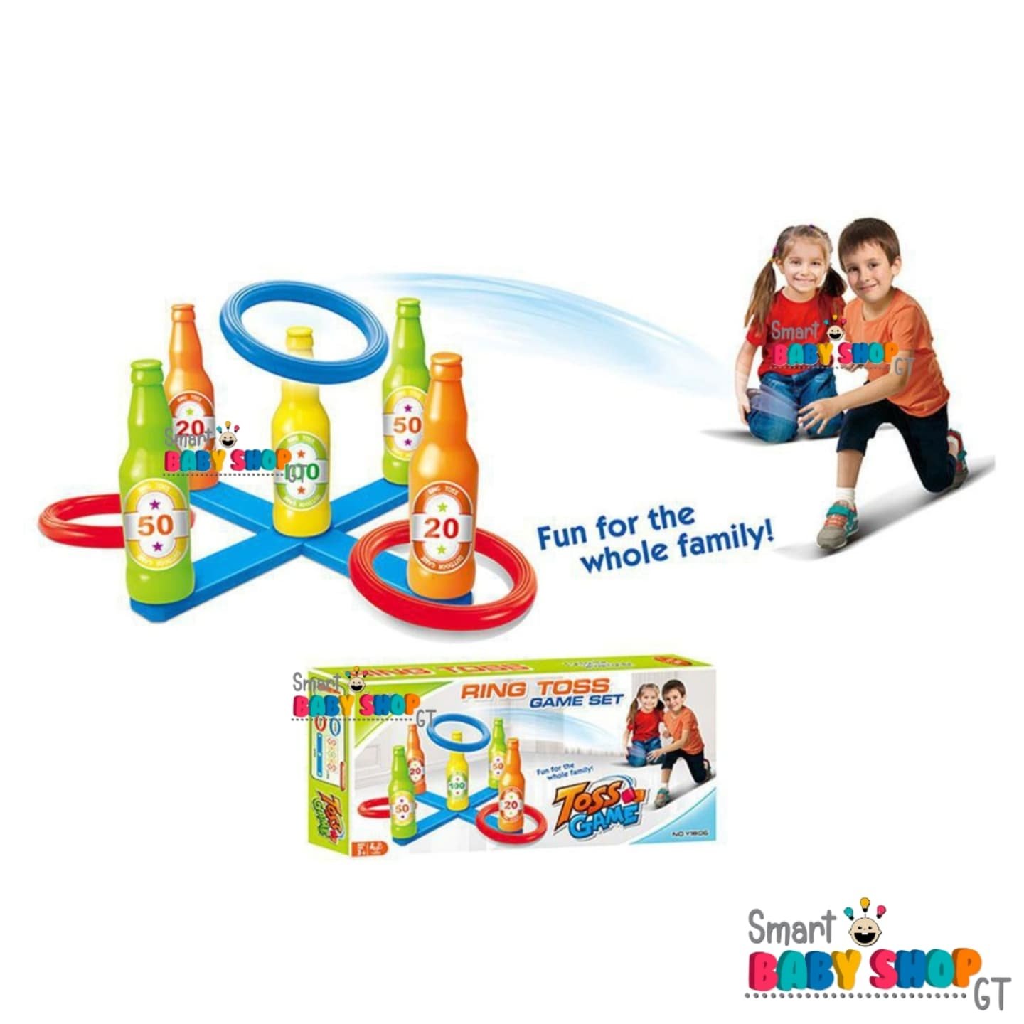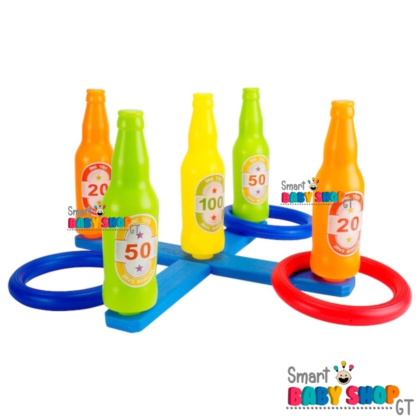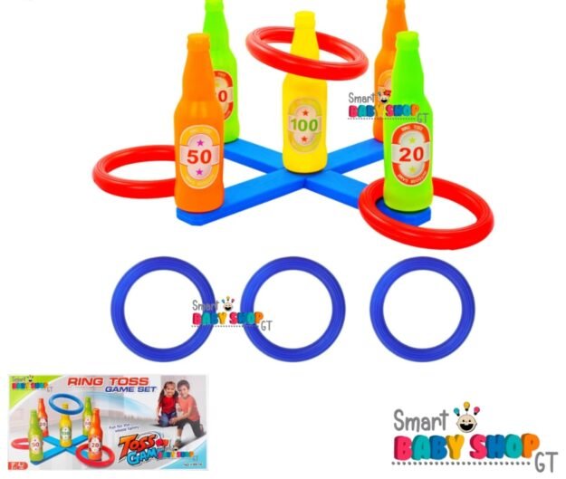 Incluye 6 aros de 17cm (3 rojos y 3 azules) y una base para colocar 5 botellas de 22cm de alto. Ideal para 2 a 4 jugadores. Material: Plástico duro no tóxico.