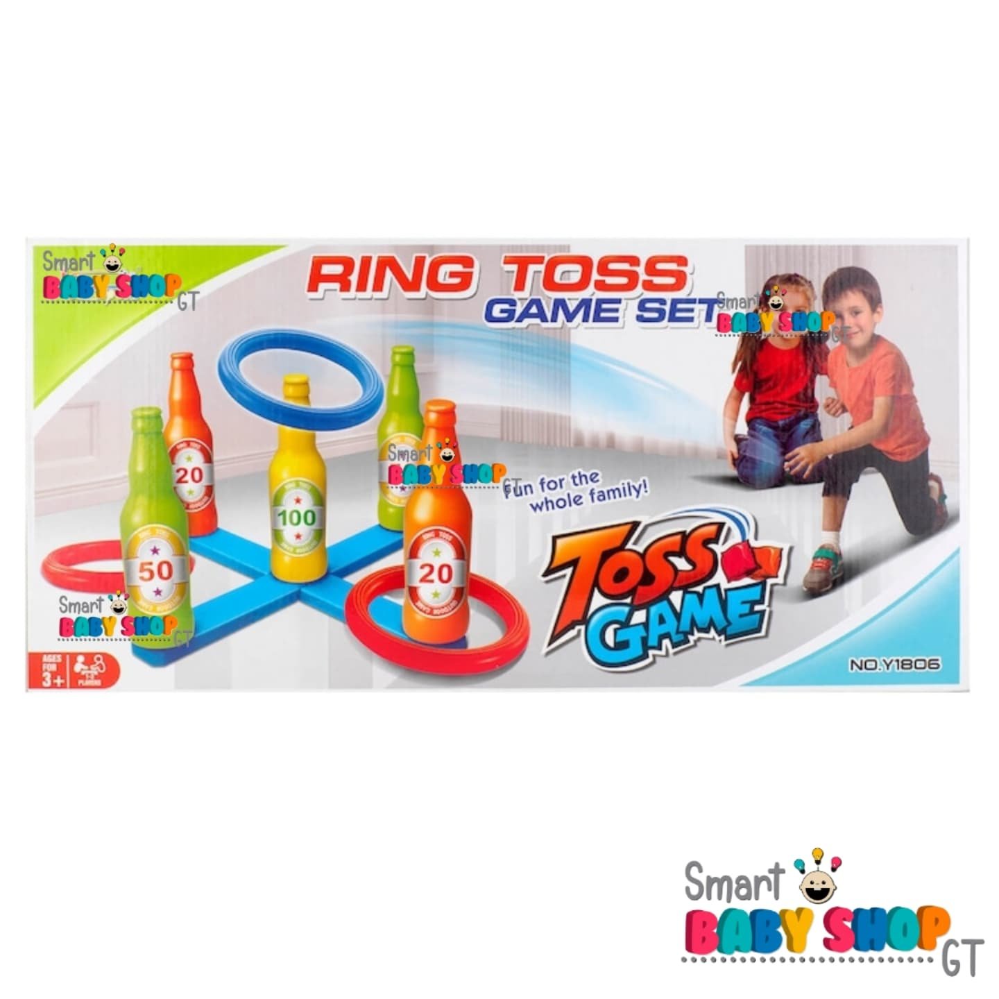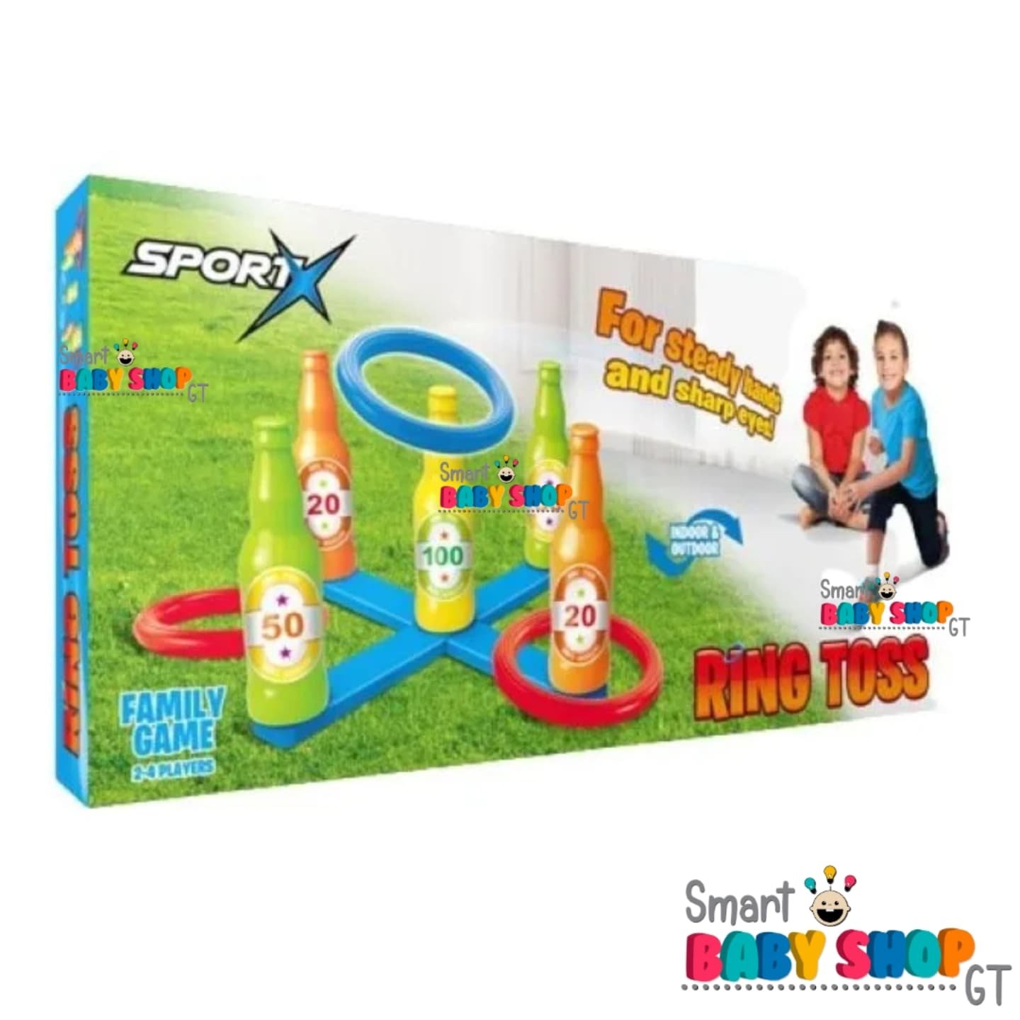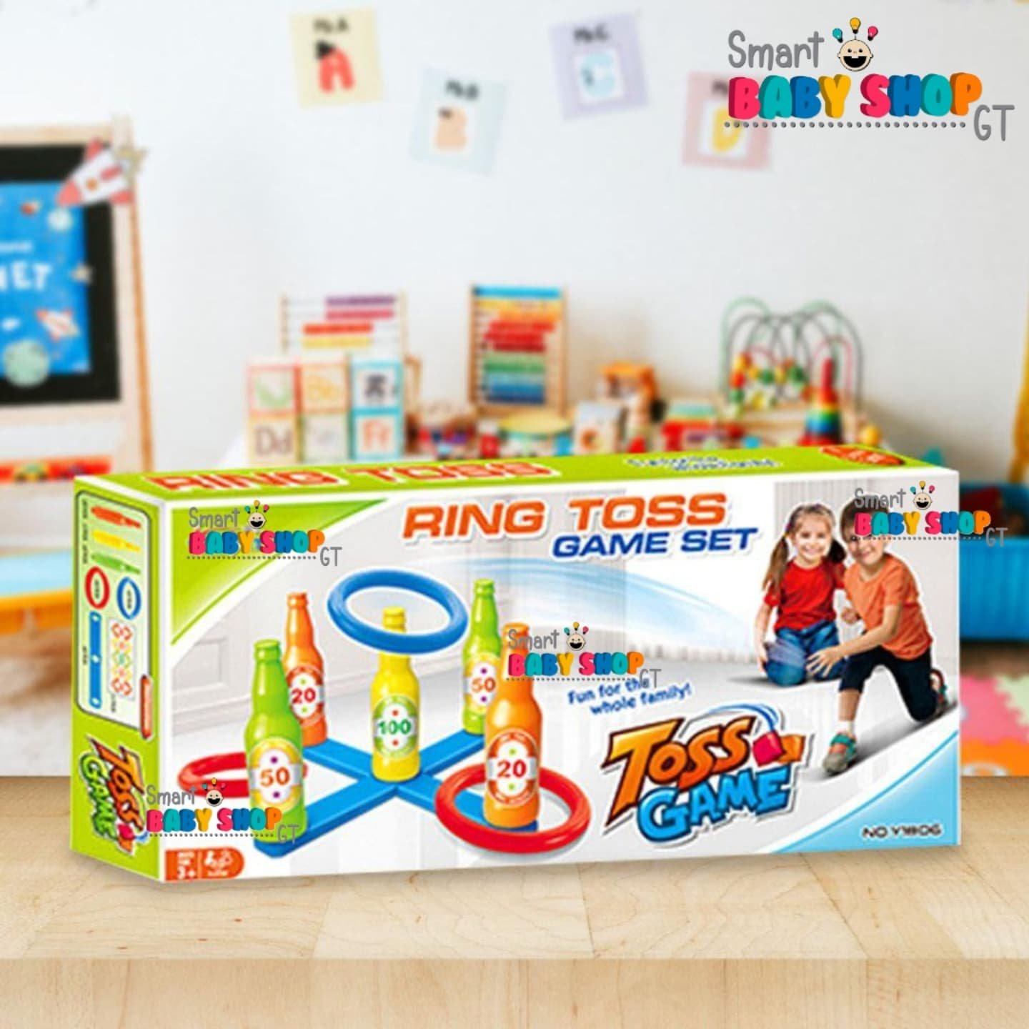 Incluye 6 aros de 17cm (3 rojos y 3 azules) y una base para colocar 5 botellas de 22cm de alto. Ideal para 2 a 4 jugadores. Material: Plástico duro no tóxico.