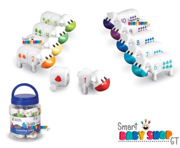 10 vaquitas de 2 piezas cada una. Color blanco combinado con diferentes colores alegres. Hecho de plástico resistente. Incluye números del 1 al 10. Codificación por colores y números. Se juntan y se separan fácilmente. Cuenta con su cubetita plástica para almacenarlas.
